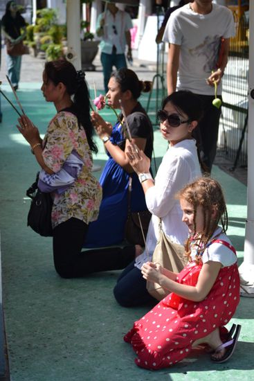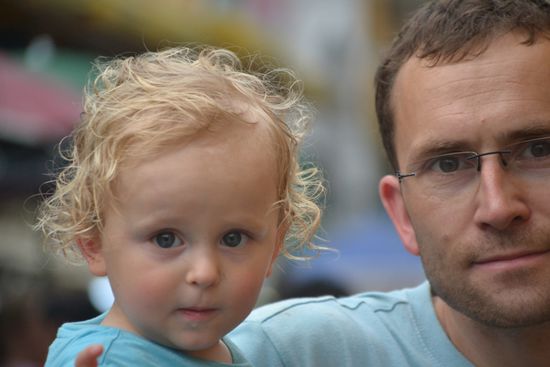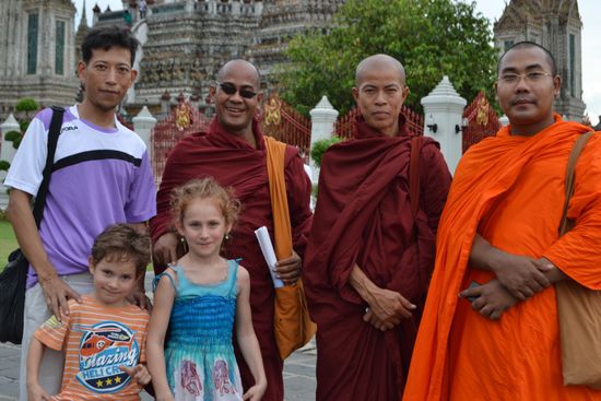 Wir essen an einem Straßenstand mit Sitzmöglichkeit, bleiben den Rest des Tages am schönen Wat Arun und erregen (wir hatten es bereits erwartet) wieder erhöhtes Interesse der Asiaten, besonders Matteo (es folgen Nevio und Maya mit aufsteigendem Alter).
