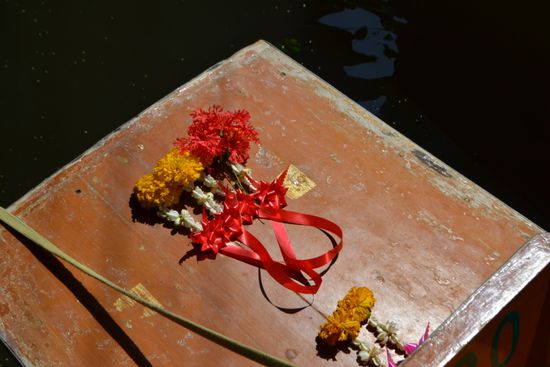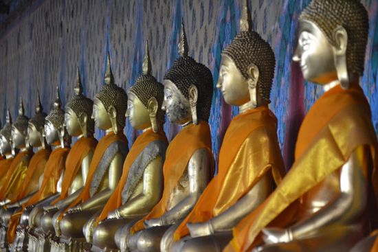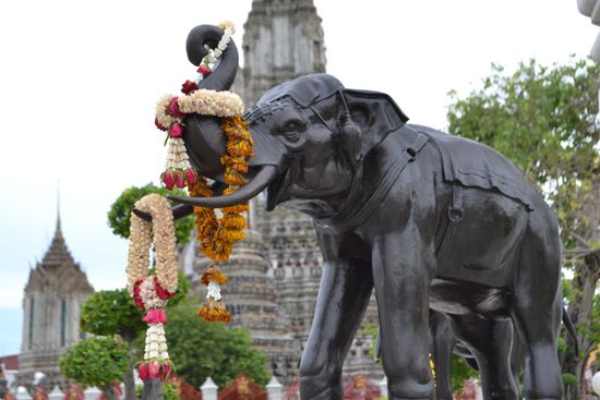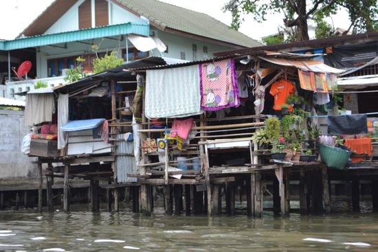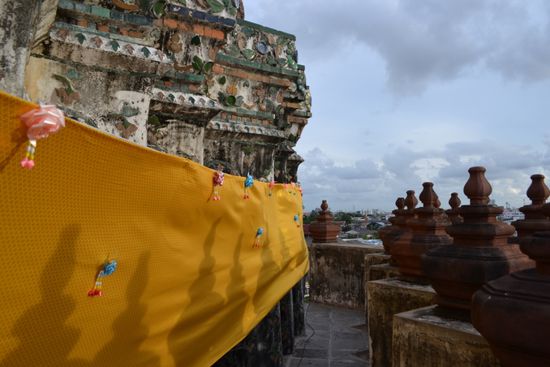 Am nächsten Tag laufen wir mittags los, schleichen vorbei an zahlreichen Verkaufsständen durch hinterste Straßen und Gassen und treffen am Nationalmuseum auf einen Thai, der für uns einen günstigen Tuk Tuk Fahrer klarmacht (50ct für 5min Fahrt). Dieser bringt uns zu einem Steg abseits der Touristenmengen und wir buchen eine Langbootfahrt durch die Klongs (Wasserkanäle), die die Stadt durchziehen und früher wichtige Verkehrswege darstellten. Vorbei an verkaufenden Frauen in ihren Booten und anderen Touristenfallen bekommen wir einen interessanten Blick auf einige Viertel Bangkoks. Nach der Stunde Fahrt lassen wir uns am Wat Arun am Flussufer des Mae Nam absetzen und weil der Bootsführer gleich wieder verschwindet, dürfen wir in die nächste Touristenfalle treten (20Baht Anlegegebühr...).