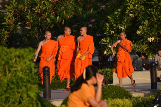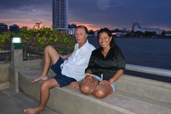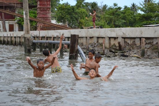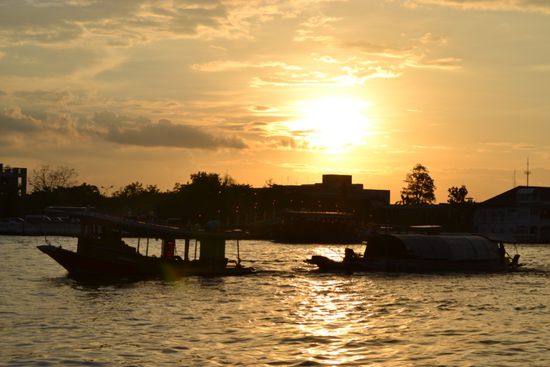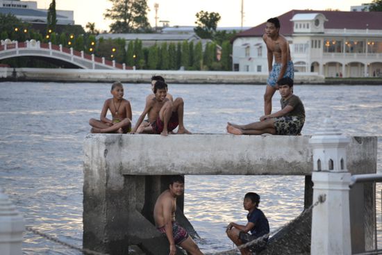 Im Wat Po - einer Oase der Ruhe (der Luft jedenfalls nicht bei 10Mio Einwohnern und permanenten Staus) kann man einen ca. 30m langen liegenden Buddha betrachten und in vielen Tempeln und Pagoden wandeln. Am Flussufer haben wir dann den Kindern Auslauf gelassen und den Beobachtern Fotoobjekte geliefert. Wir haben gelesen, entspannt, den einheimischen Kindern beim Baden zwischen den Booten zugeschaut, in der Abendsonne Bilder gemacht sowie mehrere Mangos verspeist.