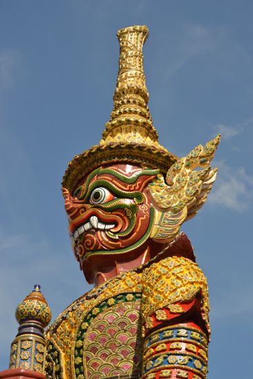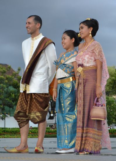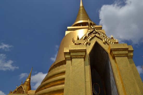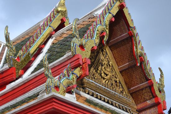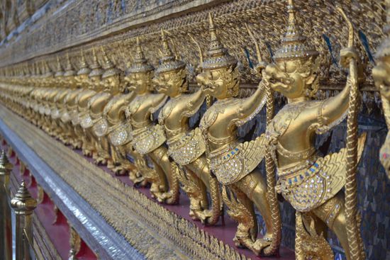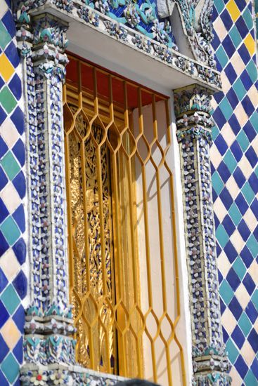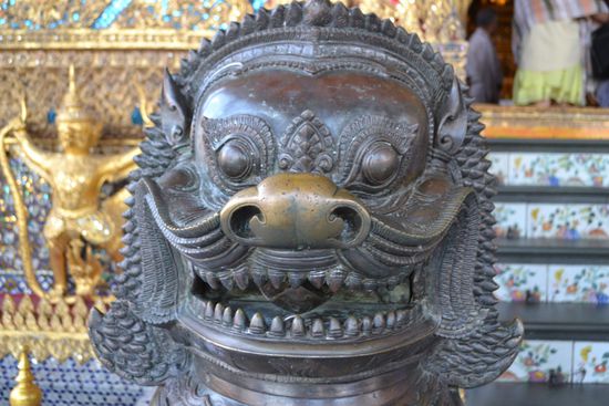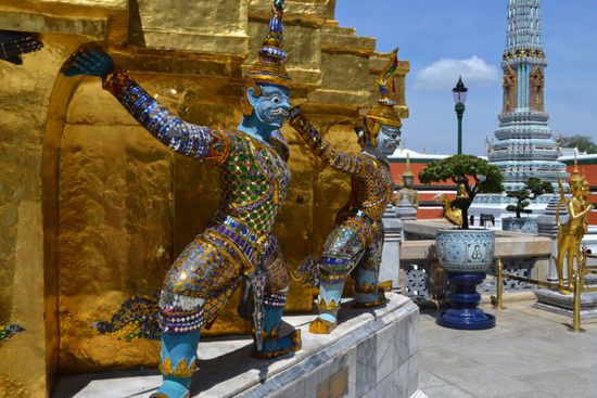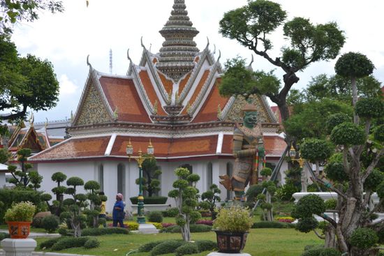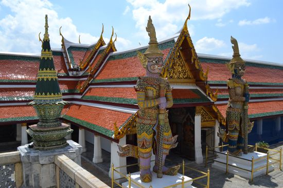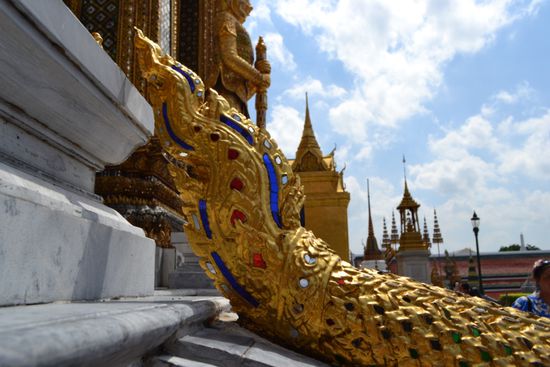 Während es an den ersten beiden Tagen noch einige Monsunschauer der mittleren Stärke gab, präsentiert sich Tag 3 sonniger. So geht es wieder per Tuk Tuk und mit der täglichen Wasserration von 5l Wasser im Gepäck zum Wat Phra Kaeo und Königspalast. Hier sind die Massen unterwegs und der Planet brennt. Das man lange Kleidung tragen muss, trägt nicht gerade zur Verbesserung der körperlichen Klimaanlage bei. Aber dafür können wir schöne Fotos machen und den Smaragd-Buddha sowie viele andere Statuen bestaunen. Anja ist von den Farben und Bauformen sehr angetan.