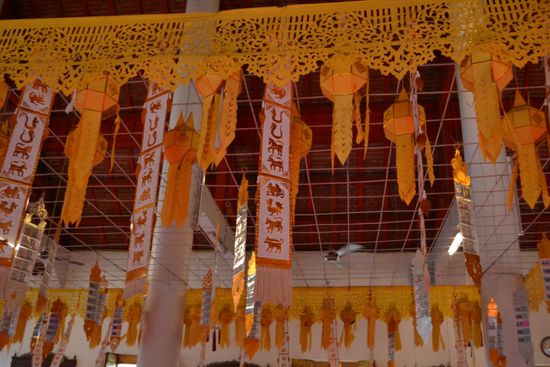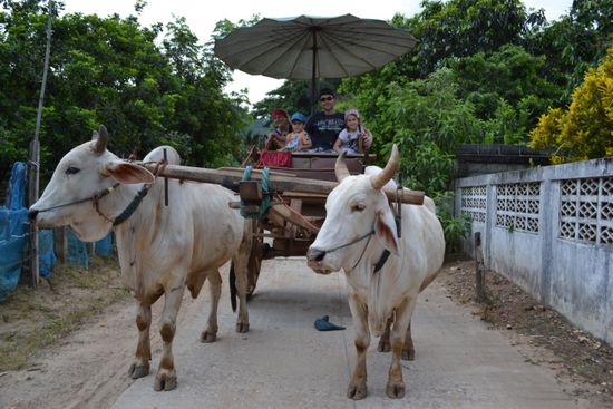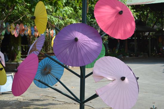 Am Guesthouseeingang hat uns ein 'Schlepper' abgefangen und wollte uns zum Elefant-Trekking überreden, gleich jetzt. Wir haben für den nächsten Tag Interesse bekundet und für einen Nachmittagsausflug zu den Handwerkern der Region (Schirme usw.) für heute zugesagt. Schon 3 Läden weiter haben wir uns eine nette Dame zum Wäsche waschen auserkoren, die nebenbei auch Tagestouren in die Region anbietet. Und weil sie so seriös war und uns nichts aufschwatzen wollte, haben wir da die Elefanten-, Ochsenkarren- und Floßtour gebucht, zudem noch günstiger.