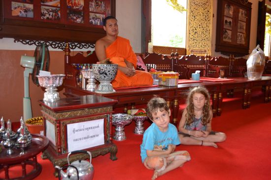 Durch die ersten Berge erreichen wir nach 5,5h Fahrt die zweitgrößte Stadt Thailands im hohen Norden. Ein netter Fahrer kennt zufällig 1-2 Guest Houses (die dem selben Besitzer gehören und der bestimmt eine nette Vermittlungsgebühr zahlt) und fährt uns in die Stadt. Wir entscheiden uns für das bessere Lai-Thai, da es einen Swimmingpool hat und die Kinder schon vorab begeistert sind. Nach dem Anbaden geht es am Abend noch etwas durch die gemütlichen Straßen/Gassen der Altstadt.