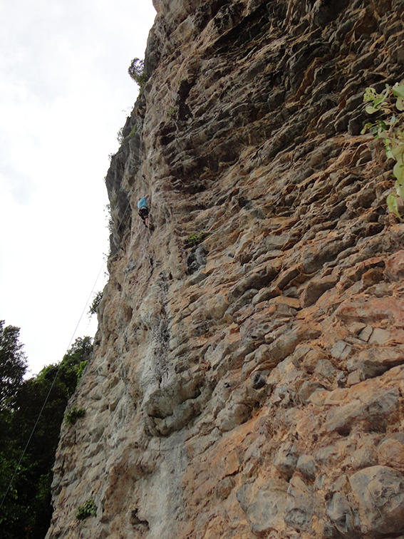 Als wir ankamen war das Wetter perfekt, wir haben Straende und Meer genoosen. Die Bucht direkt vor unserer Tuer, Loh Dalam, ist ein ewig langer, weisser feiner Strand, flaches klares Wasser, herrlich fuer Kaliopi und fuer die Grossen gibts fuer Geld sogar Liegestuehle Da wir einen Feind des Sandes mit haben, investieren wir mit Freuden in Liegestuehle und Sonnenschirme! Und leider war die Investition auch nicht gross bis heute. Das Wetter hat umgeschlagen und seit ein paar Tagen haben wir zwar immernoch 33 Grad, allerdings mit Windboeen und heftigen Regenguessen. Stoert bisher aber kaum, wir waren Klettern, das war kein Problem, da die Felswaende in der Ton Sai Bucht wettergeschuetzt sind, man ist immer im Schatten und so gut wie nie im Regen. Burnin' hatte riesen Spass mit unserem Guide, da der schnell einschaetzen konnt, was er drauf hat und die beiden dann ihr Programm gestaltet haben. Incredible sollte vielleicht noch lernen, dass man die Leute, die einen sichern und unten stehen und Tipps geben, wies besser hochgeht, nicht unbedingt aus vollem Hals anbruellen muss, kostet nur Kraft und man ist hinterher in der ganzen Bucht bekannt ("How was it? We could hear you... ).