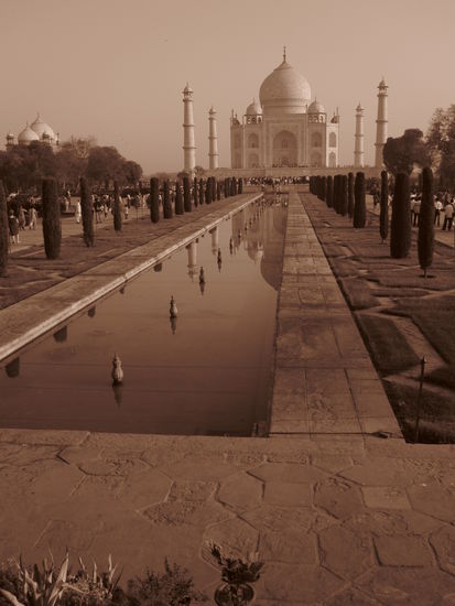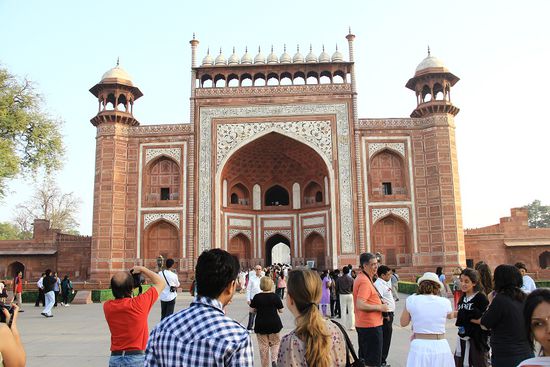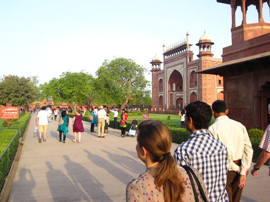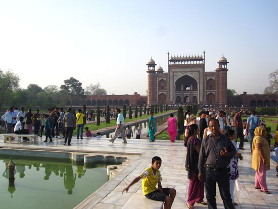 Wir draengelten uns durch das schmale Tor und da war er... Der indische Klassiker. Das Symbol der Liebe, was ein liebestoller Maharaja als Andenken an seine Frau hat bauen lassen, die bei der Geburt des 14. Kindes gestorben ist. 20.000 Personen bauten ueber 20 Jahre daran...