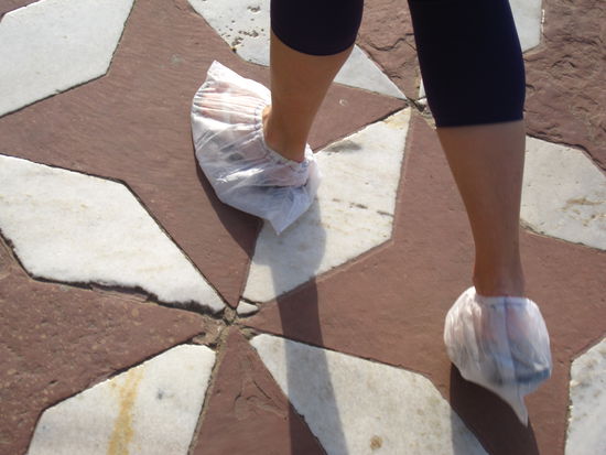 Am Taj angekommen, mussten wir uns chice Fuesslinge ueberstuelpen, um den Bodenbelag zu schonen (meiner Meinung eher, um selbigen zu polieren)