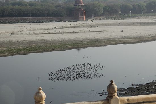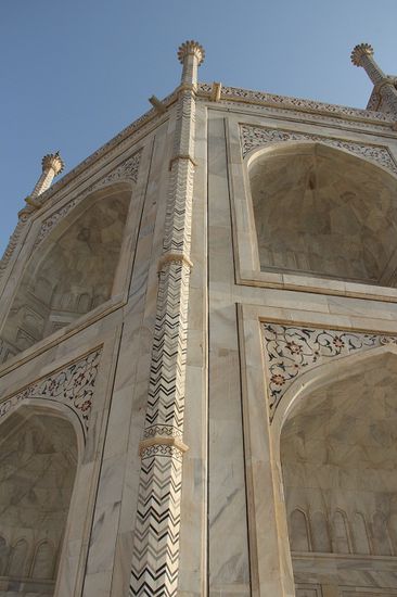 Klaustrophobiegeplagte duerften den Taj von innen nicht betreten. Von trillerpfeifenden Tuerstehern hineingezwungen, kam man innen nur voran, indem man sich mit der Masse einmal um das Grab schob. Die Luft war stickig und rauecherstaebchengetraenkt. Und obwohl man innen offiziell keine Fotos machen durfte (woran die dummen Deutschen sich natuerlich gehalten haben), hielten alle Ihre Iphones in die Luft und Kameras blitzten.