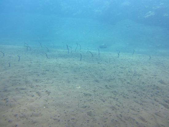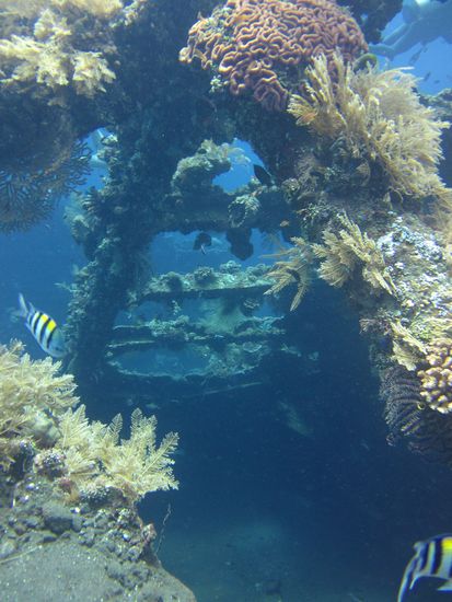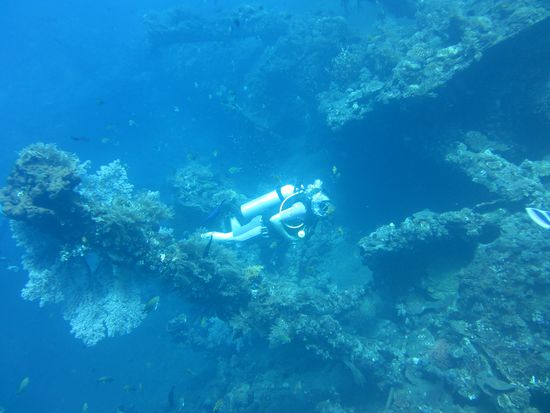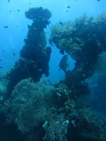 Die USS Liberty wurde dort im 2. Weltkrieg nach einem Torpedoangriff der Japaner versenkt. Man kann direkt vom Strand aus rein, ca. 40Meter weiter fängt dann schon das Wrack an. 124 Meter lang ist das Schiff und es liegt in 10 bis 30 Meter tiefe.