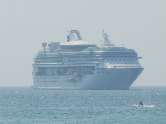Wir machen noch ein Foto von einem Kreuzfahrtschiff, was vor Anker liegt .....und finden unser Plätzchen....