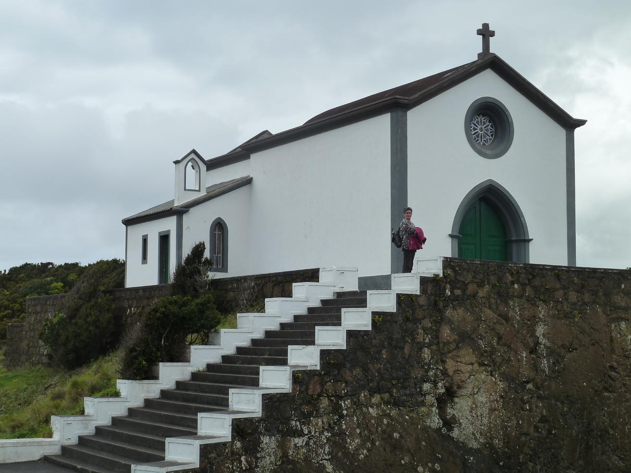 Langsam aber stetig geht es den Berg hinauf - am Ende liegt eine Kapelle (geschlossen) - auf dem Plateau nebenan sitzt ein Mann auf einem Holzbänkchen mit angebautem Fernglasständer und spricht in ein Sprechfunkgerät. Ich hab mir zwar gedacht, dass er nach Walen Ausschau hält, aber bestätigt wird uns das erst durch ein Bild im Museum der ehemaligen Walfangstation, die wir nach unserem Abstieg besichtigen.