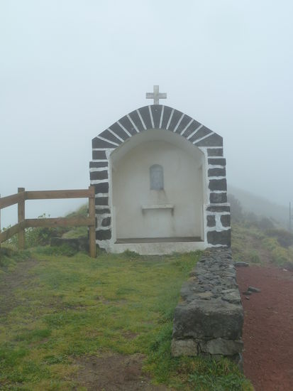 Von der Nordostspitze der Insel wird es nun windiger und es fängt an zu nieseln. Die Wolken ziehen westwärts und bei Cedros haben wir die Idee, es könnte die Caldeira oberhalb der Wolken liegen. Also fahren wir die Strecke über eine nicht asphaltierte Forststraße nach Süden und in zahlreichen Kurven bis auf fast 1000 m Höhe, um festzustellen, dass wir wir nichts sehen. Auch der virtuelle Cache GC2B84N kann nicht vollständig geklärt werden: uns fehlt eine Antwort zu den vier Fragen. Ein Pärchen, das wir schon an mehreren Haltepunkten gesehen haben, hatte wohl die gleiche Idee. Wir müssen uns also wieder verziehen.