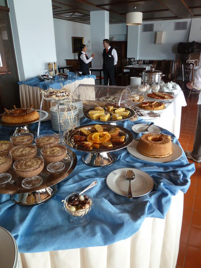 Dann wird es endlich Zeit zum Mittagsbuffet der Pousada. Die Bedienung erkennt uns wieder - wir sind die ersten Gäste und man trägt noch auf. Aber die Suppe könnten wir schon probieren, meint die freundliche Dame. Wir warten noch was und dann probiere ich die Fischsuppe, die wie in Frankreich schmeckt, nur fehlen die Rouille, die Croutons und der Käse. Danach geben wir uns an die leckeren kalten Sachen. Muschelsalat, Scampis, boeuy gestuffed, und die Scheren von ihm - aber die bekomme ich nicht geknackt - beim Abräumen zeige ich der Dame, dass die Scheren so nicht zu knacken sind. Daraufhin räumt sie die Platte praktisch leer und verschwindet in der Küche und nachdem man es hämmern hörte, kommt sie mit einem ganzen Teller zertrümmerter Scheren zurück. Ulrike ist inzwischen beim dritten oder vierten Kaltgang. Auch ich gehe nochmal und empfehle ihr die vor Knoblauch stehende Sauce zu den Scampi. Den eigentlich Warmgang läßt Ulrike ganz aus, sie hat nämlich creme caramel gesehen. Ich möchte jedoch mitreden können und gönne mir eine ganz kleine Portion seafood-stew (mit weißen Bohnen), bevor ich die mousse au chocolat vernichte. Zum Kaffee braucht Ulrike dann noch einen Brandy. Die freundliche Dame erklärt den Kaffee als Gratisofferte des Hauses, da wir noch beim Auftragen haben zuschauen müssen.!
