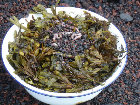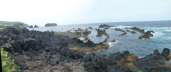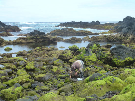 Wir starten heute die Tour im Uhrzeigersinn von Ginetes und fahren an Ferraria vorbei, das wir ja schon besucht haben. An der Nordküste ist Mosteiros unser erster Stop: Dort sind wieder Meeresschwimmbecken, in herrlicher Kulisse mit kleinen spitzen vorgelagerten Inseln. Zwei Männer suchen etwas im Schlickkies, wir steigen zu ihnen hinab und stellen fest, dass es winzige Würmer? oder Fischli sind, die wohl beim Angeln als Köder benutzt werden.