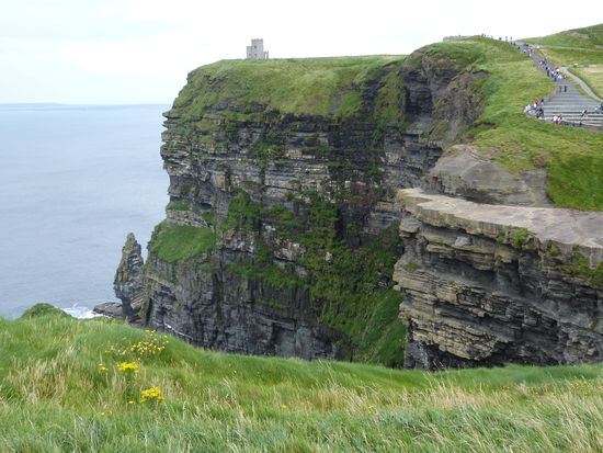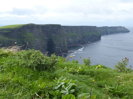 Für uns sollte es nun wieder weiter die Westküste Richtung Süden gehen. Dazu fuhren wir durch die Region "Burren". Die Landschaft ist ca.160 Quadratkilometer groß und besteht aus Kalkstein, was ihr das Aussehen einer Mondlandschaft verleiht. An die Burren schließen die bekannten "Cliffs of Moher" an. Die spektakulären Steilklippen erreichen eine Höhe von bis zu 214 Metern und an vielen Stellen ragen sie senkrecht aus dem Antlantik heraus. Die Szenerie ist wirklich beeindruckend. Ein Teil der Klippen ist offiziell als Gehweg ausgegeben, jedoch werden auch die ungesicherte Wege am Klippenrand - trotz Verbot und mit zum Teil zweifelhaften Absichten -benutzt. Hier sind dann auch die Schilder zu sehen auf den steht " You need to talk? - Call the number ...." der regionalen Telefonseelsorge.