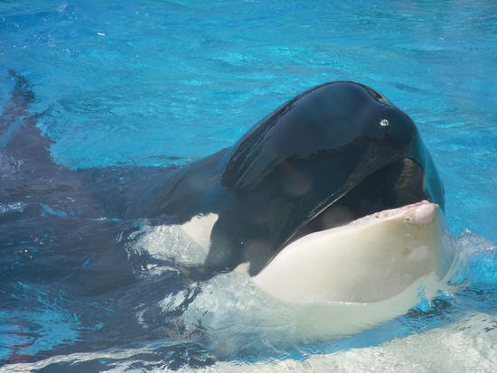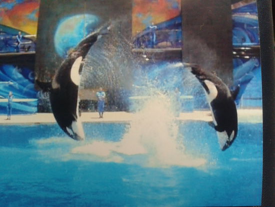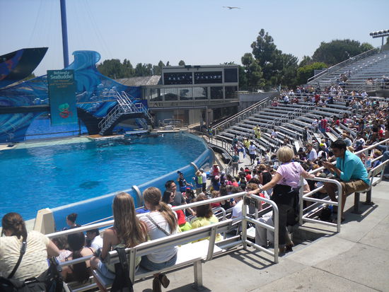 Nach diesem klasse Erlebnis mit den niedlichen Delfinen ging ich langsam in Richtung Orca - Show. Diese findet in einem großen Stadion statt. Die Sitzreihen sind halbmondförmig um das Showbecken aufgebaut. Die vorderen 16 Reihen befinden sich in der sog. "Soak Zone". Hier wird man garantiert nass. Jeder weiß das, aber manche wollen nass werden. Und zwar richtig nass. Die schweren Wale bekommen extra den Befehl zum springen oder spucken. Die Show dauert 20 min. Ich hatte einen sehr guten und trockenen Platz