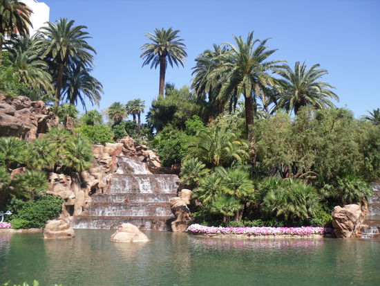 Das interessante an Las Vegas ist die Vielfältigkeit. Eben bist du noch in New York und im nächsten Moment bist du in Monte Carlo, Paris, Venedig oder in der Karibik. Obwohl Las Vegas mitten in der Wüste liegt, gibt es hier viele grüne Rasen, Pflanzen und Bäume. Auch mehrere Golfplätze, was ich als ziemliche Wasserverschwendung ansehe, denn schließlich muss das ja auch alles bewässert werden damit es grün bleibt. Naja, was in Vegas ist keine Verschwendung?