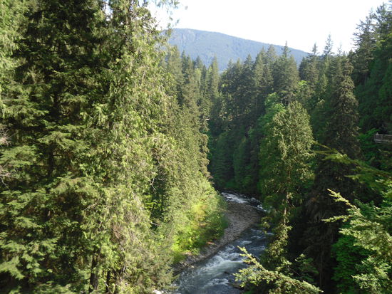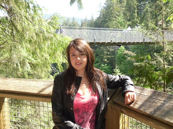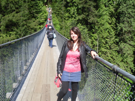 Laut Plan wollte ich heute eigentlich shoppen gehen. Doch es war so tolles Wetter, das ich mich entschied mein Montagsprogramm vorzuziehen. Eine gute Idee. Mit einem free Shuttle fuhr ich erstmal zur Capilano Suspension Bridge, die auf der nördlichen Seite von Vancouver liegt. Es ist eine 140m lange Brücke, die sich in 80m Höhe über einen Fluss erstreckt. Die Brücke ist mit dicken Stahlseilen gesichert, es sah sehr sicher aus. Ich bin wie ganz selbstverständlich auf die Brücke rauf marschiert , bis mir dann ungefähr in der Mitte einfiel, dass ich ja eigentlich nicht ganz schwindelfrei bin... Die andere Hälfte des Weges war dann schon etwas schwieriger. Aber die Aussicht war super. Der kleine Fluss und die großen grünen Bäume, das ist für mich Kanada