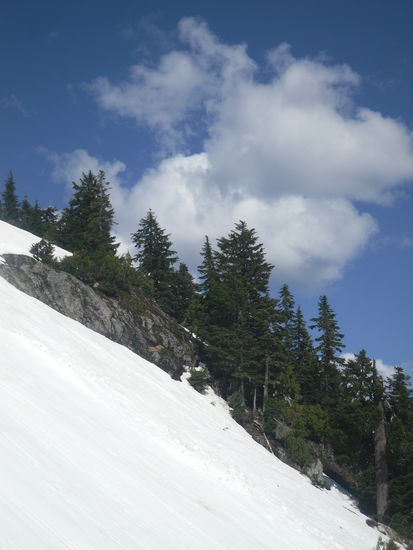 Die $40 haben sich wirklich gelohnt. Schon allein die Seilbahnfahrt war super. Von hier aus konnten wir auch die Länge des Hikingweges sehen...was für eine Schnapsidee! Als wir oben ankamen, standen wir erstmal im Schnee. Das sah toll aus, besonders mit den Tannen. Der Temperaturunterschied betrug nur 4 Grad, so konnten wir im T-Shirt in der Sonne sitzen