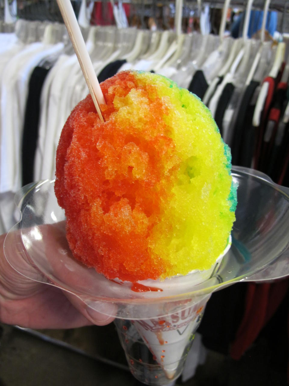 Danach gings noch ein paar Meter ganz gut, bevor es langsam zu tröpfeln began, dann nieselte und schließlich bei Hale'iwa richtig regnete. Hale'iwa is ein kleines Örtchen am North Shore, das das Surfzentrum am North Shore is und außerdem liegt dort Matsumoto's. Ein Laden der hauptsächlich Shave Ice verkauft und eigentlich der bekannteste für Shave Ice auf der Insel is. Dort hab ich dann gehalten und bin schnell durch den Regen zum Eingang gerannt. Es war einiges los, sowohl außen unterm Dach als auch im Laden, überall haben sie Shave Ice gegessen, meistens den Typ Regenbogen, den ich dann auch genommen habe.