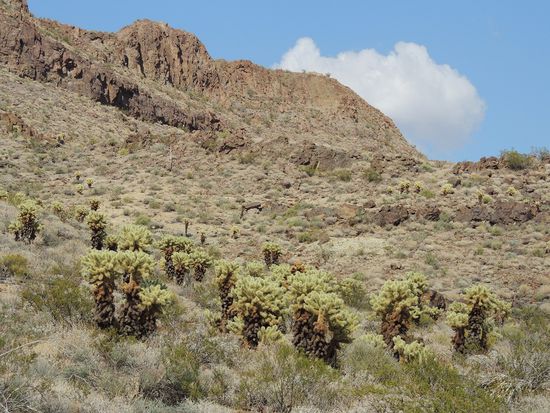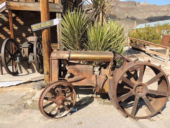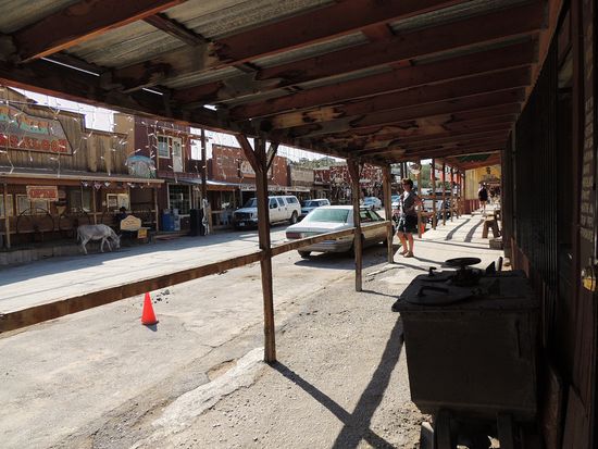 Ab Kingman wird die Route interessanter. Es geht über eine Buckelpiste ins Gebirge. Traumhafte Landschaft mit uriger Vegetation. In Serpentinen über den Pass und mit tollen Blicken nach allen Seiten fahren wir bis Oatman. Hier fühlt man sich wie im Film. Hier wird der Western lebendig. Hier muss doch gleich John Wayne um die Ecke biegen. Diese Traumkulisse im Hintergrund. Alles so unwirklich, aber unheimlich schön. Und deshalb geht es gleich mal auf ein Eis in den Saloon, putzig.
