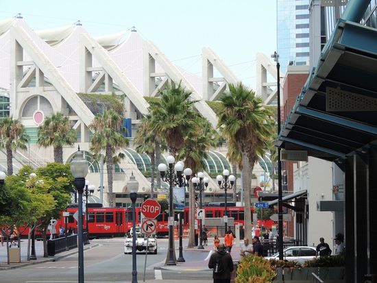 Der letzte Tag in San Diego war wieder durchgestylt. Zuerst warfen wir einen Blick nach Downtown. Das riesige Stadion der Padres kann man besichtigen. Daneben das nicht minder kleine Convention Center mit Blick zum Hafen, davor die Bahnlinie. Diese nutzt die Straßenbahn, aber auch die Bahn. Und tatsächlich kam auch eine. Da in Amerika bekanntlich alles größer ist, so auch dieser Zug. 5 Loks vorn dran und hinterher weit über 100, 200 Waggons. Kaum zählbar. Der fuhr so langsam, sodass man in der Zeit ruhig eine Kanne Kaffee kochen kann. Wir haben uns überlegt, wo wohl die Lok ist, wenn der letzte Waggon hier vorbei kommt.