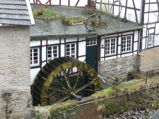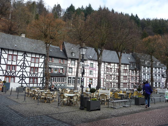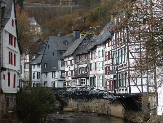 In der Nacht erfüllten sich die schlechten Wetterprognosen und es begann zu regnen. Gegen morgen ging er zwar nur in einen leichten Nieselregen über, dennoch war es eher ungemütlich und "usselig" draußen. Unsere Töchter berichteten gar von Schneefall zuhause. Ok - da hatten wir direkt das bessere Los gezogen. Nach einem ausgedehnten Frühstück machten wir uns auf den Weg nach Monschau - die sogenannte "Perle der Eifel". Unterwegs bekamen auch wir einen Graupelschauer ab, aber in Monschau schien bereits die Sonne. Wenn Engel reisen