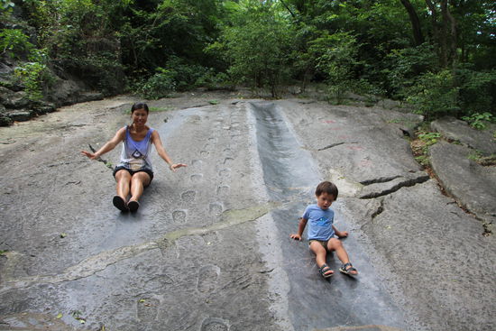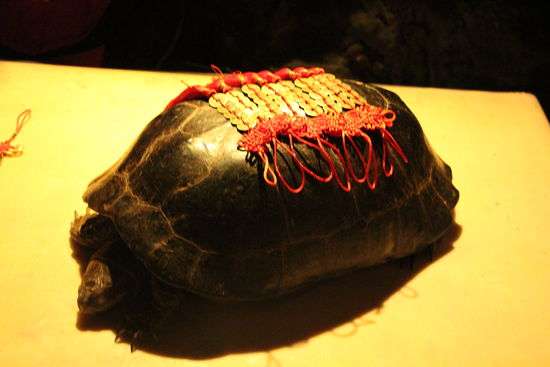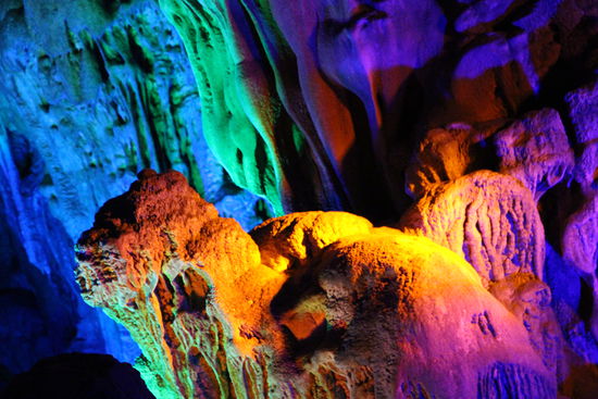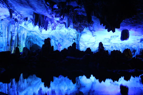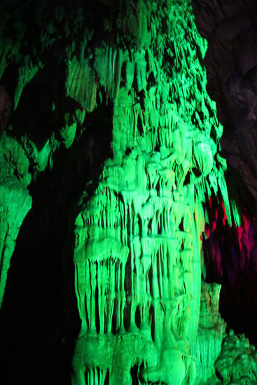 Wir fanden einige tolle Restaurants und wir übernachteten auch in einem sehr netten Youthhostel direkt am Fluß. Um zurück zu unserer Straße zu kommen, mußten wir uns schon einmal mit einem ZHUFA (Bambusbötchen) über den Fluß bringen lassen. Ganz besonders schön war auch der Besuch des Reed Flute Caves - einer gewaltig großen Tropfsteinhöhle. Die Steine erstrahlten in bunten Farben, was anfangs kitschig wirkt, aber mit der Zeit lässt man sich davon überwältigen. In der Höhle sah man auch eine mehrere hundert Jahre alte Schildkröte.