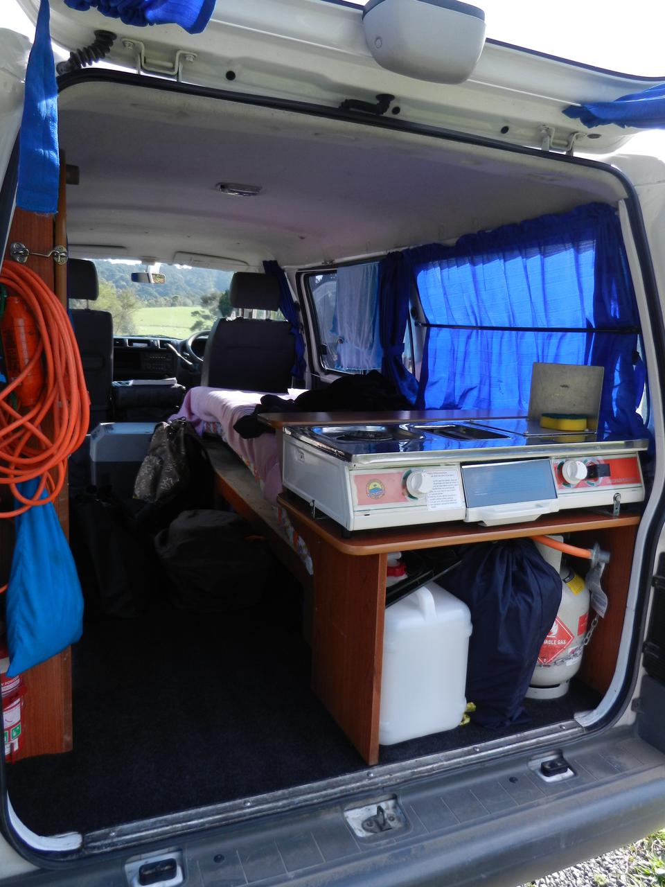 ...klein, aber fein! Alles da was man braucht: Wasserkanister, Gasherd inkl. Ofen, Verstauraum, Kuehlschrank, ausklappbarer Innentisch, Stuehle und Tisch fuer draussen und natuerlich das ausziehbare Doppelbett!