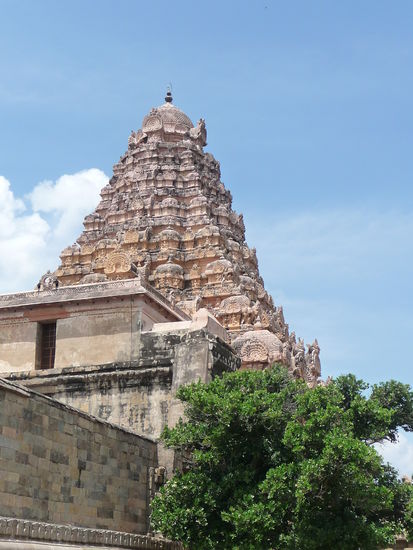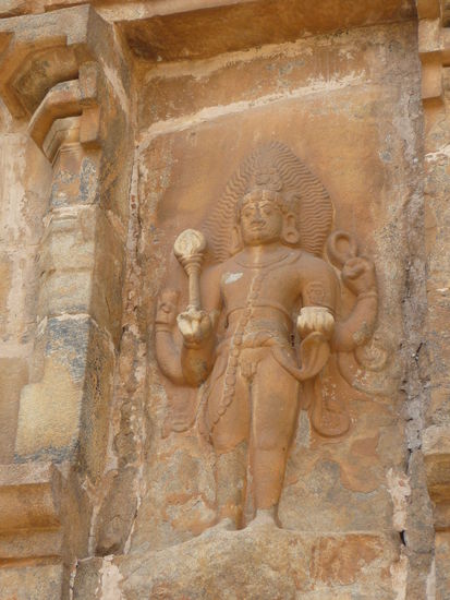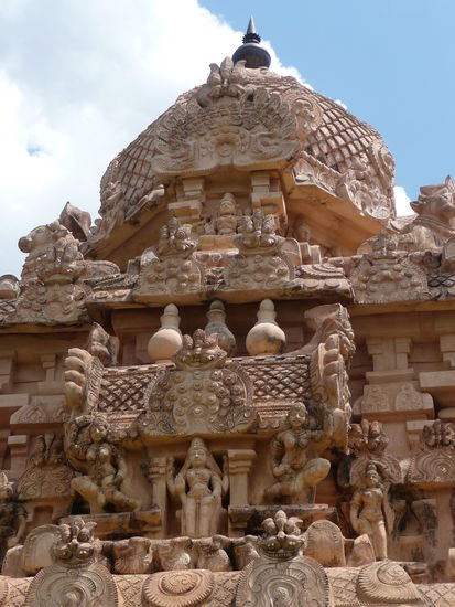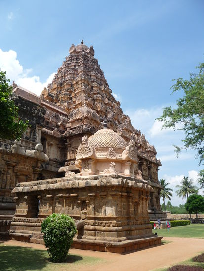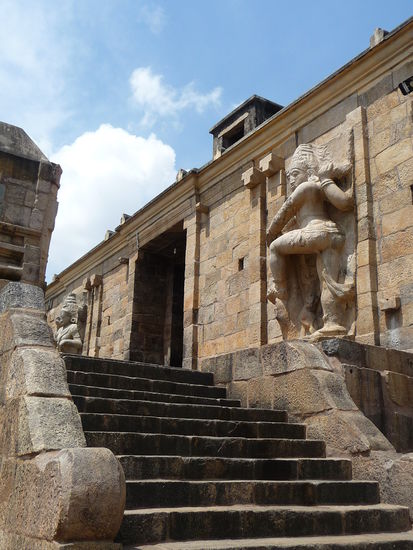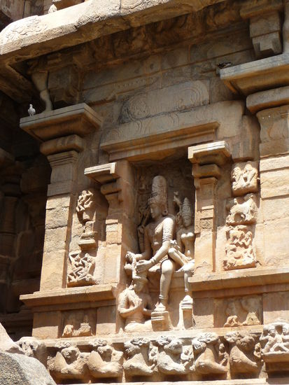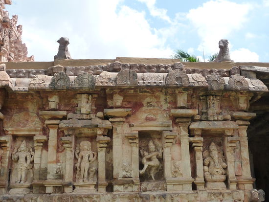 Weiter geht es nach Gangaikonda einen kleinen Dorf das früher mal die Chola Hauptstadt war die von Rajendra I. ( 1012 - 1044 ) gegründet wurde. Im Zentrum ließ er den Gangaikondacholishvara Tempel erbauen. Überragt wird die Anlage vom 58 m hohen Vimana Turm an den viele schöne Götterskulpturen zu sehen sind. Große Teile der Anlage wie Paläste und Umfassungsmauer sind heute verschwunden weil diese von der einheimischen Bevölkerung als Steinbruch diente u.a. zum Bau eines Wasserdamms. Einige Ähnlichkeiten mit dem Brihadeshvara Tempel in Tanjore sind nicht zu übersehen den der Vater von Rajendra I. erbauen ließ. Für mich war es einer der schönsten Tempelanlagen die ich bisher auf meiner Südindien Reise gesehen habe. Seit 2004 gehört der Tempel zum UNESCO WELTKULTURERBE !