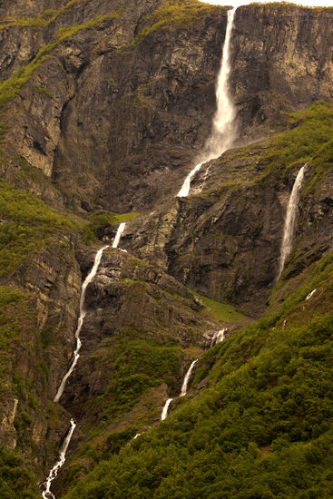 Die Fahrt Richtung Sognedal ist sehr schön, trotz des Regens, mit schönem Wetter muss es hier traumhaft sein, überall kommen Wasserfälle herunter, Wiesen mit gelben Blumen überall Berge, schade das es wirklich so verregnet ist.