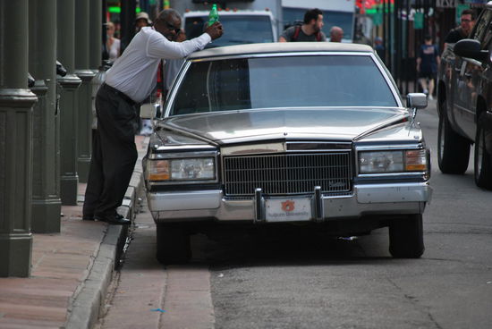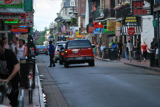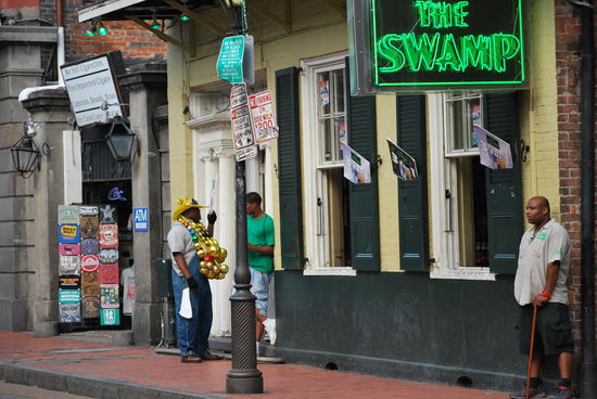Gelandet am Louis Armstrong Airport von New Orleans. Im Inneren des Flughafens sind umfangreiche Baumassnahmen im Gange. Ist das noch die Spätfolgen-Beseitigung von Schäden durch Hurricane Katrina ? Auf mein Gepäck warte ich fast eine Stunde. Oh, oh, sollte es hier genauso blöd weitergehen, wie gestern in Nashville ??? NEIN ! Als ich meine Reisetasche endlich am Haken habe, greife ich mir ein Taxi und treffe auf eine extrem coole Taxifahrerin. Sie ist rabenschwarz, dick, relativ alt, spricht heftigsten Südstaaten-Slang, nennt mich ohne Ende "Baby", "Sweetie", "Honey", obwohl sie sich sinnloser Weise nach meinem wirklichen Namen erkundigt hat. Sie nennt sich selbst "lucky lady" und gedenkt keinesfalls schweigend nach downtown New Orleans zu fahren. Sie fragt mich direkt hemmungslos aus. Nach kürzester Zeit habe ich mich an ihren slang gewöhnt und frage auch sie Löcher in den Bauch. Auf der ca. 20-minütigen Fahrt nach downtown erhalte ich eine super sightseeing-tour entlang der Aussenbezirke von New Orleans und wir vereinbaren eine Abholzeit für die Rückfahrt zum Flughafen 2 Tage später. Angekommen im St. James Hotel, das sich in bequemer Gehweite zum french quarter befindet, fühle ich mich sofort wohl. Obwohl ich wegen eines nicht funktionierenden Zimmersafes noch einmal innerhalb des Hotels umziehe.