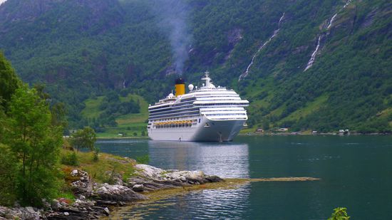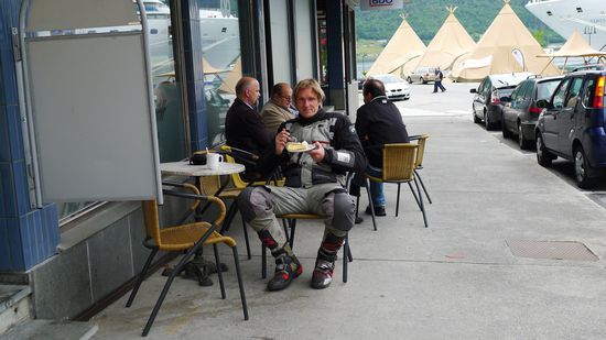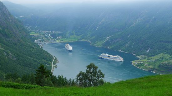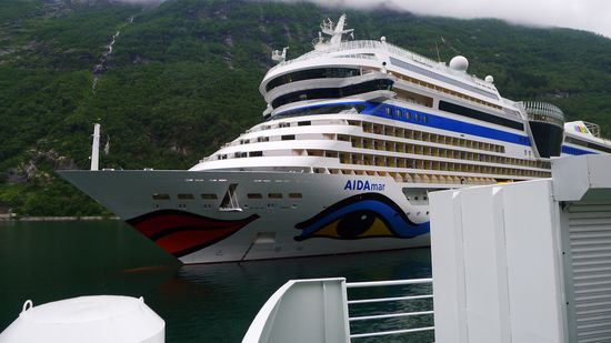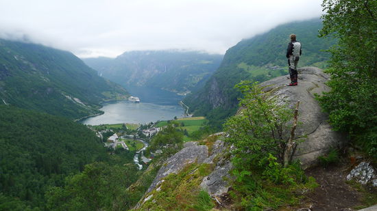 Ich unterhalte mich am Aussichtpunkt mit einem jungen Kerl, der mit seiner Freundin auf der Aida unterwegs ist, die unten im Fjord liegt.