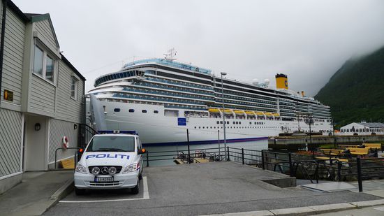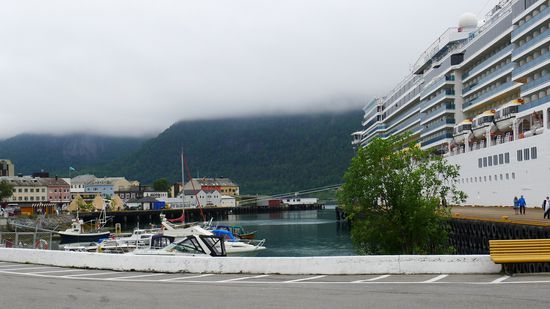 Das Größenverhältnis von Schiff und Häuser ist wirklich beeindruckend in dem kleinen Fjord...