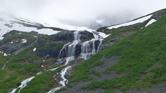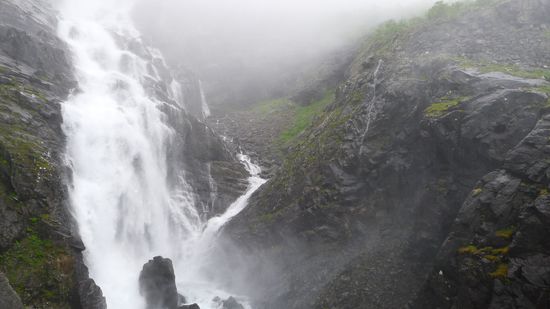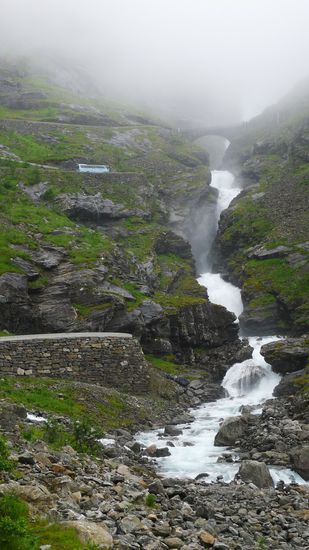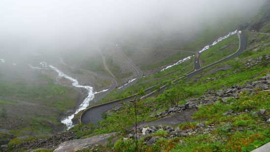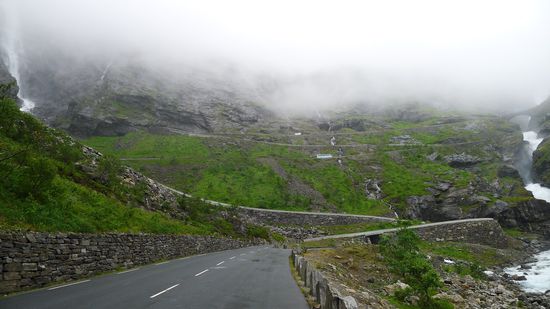 Die Wolken hängen immer noch tief, aber immerhin kann man Einiges von den Trollstigen erkennen.