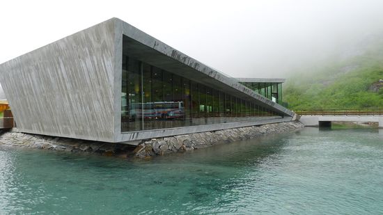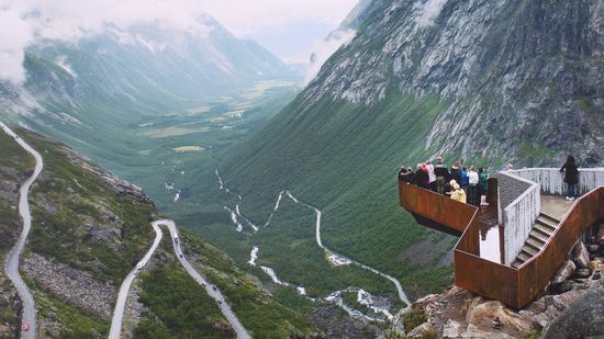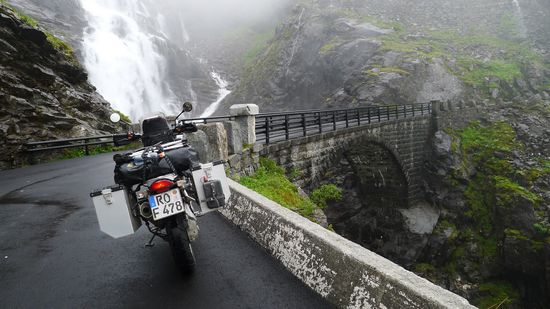 Der imposante Wasserfall Stigfossen rauscht die Bergwand in Richtung des Tals Isterdalen hinunter. Und mitten in diesem Szenario windet sich in elf Haarnadelkurven der Trollstigen die Berge bis auf eine Höhe von 852 Metern über dem Meeresspiegel hinauf.