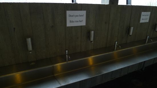 ..aber beim Design des Waschbeckens in der Toilette hatten sie wohl kein glückliches Händchen, zumindest scheinen einige männliche Zeitgenossen da ständig etwas zu verwechseln...Schilder, auf denen "Bitte hier nicht pinkeln" in allen Sprachen steht, versuchen die Zweckentfremdung des Waschbeckens zumindest zu verhindern ..