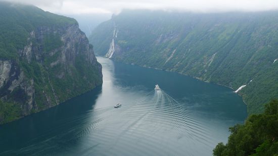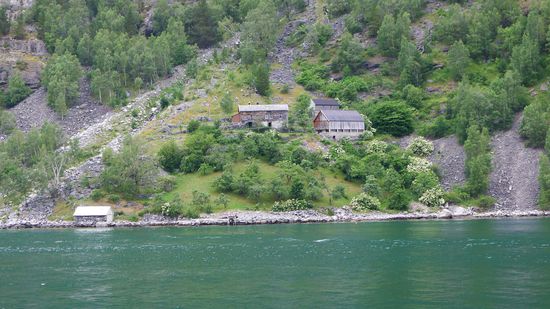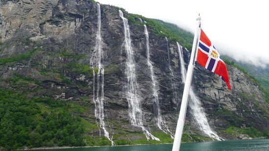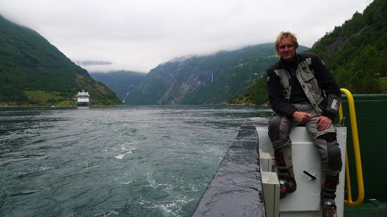 Da es zum Pflichtprogramm eines jeden Norwegen- Urlaubes gehört, mit dem Schiff durch den Geirangerfjord zu fahren, nehme ich die einstündige Fähre von Geiranger nach Hellesylt, dieser Abschnitt an den Wasserfällen und verlassenen Bauernhöfen vorbei gilt eh als der schönste Abschnitt.