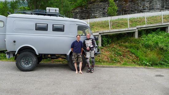 Am Geirangerfjord lerne ich auch Olsen aus Eindhoven in Holland kennen, der mit einem selbst umgebauten, sehr alten Peugeot Militärkrankenwagen unterwegs ist. Was er an Arbeit in den Wagen gesteckt hat, ist wirklich sehr beeindruckend...