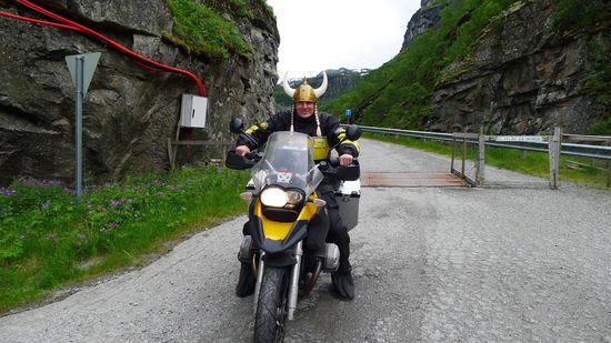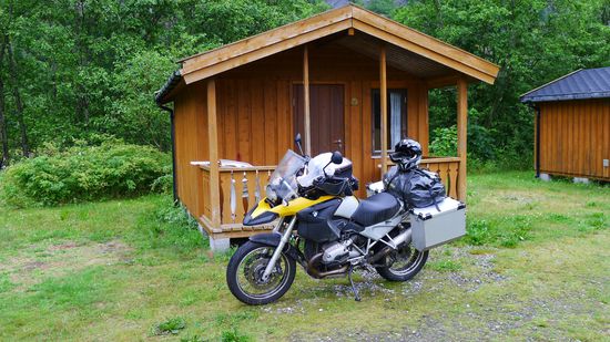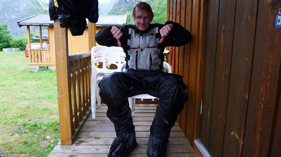 Ich jedenfalls nicht, ich schmeisse mein Waschzeug unter einen überdachten Vorbau, renne zurück, greife mir meine wenigen Habseligkeiten und Motorradklamotten, die vor dem Zelt liegen und bringe sie ebenfalls unter dem Vorbau in Sicherheit, baue das Zelt in Guinessbuch- Geschwindigkeit zusammen, packe es mitsamt Schlafsack und Isomatte schnell in die Koffer und denke bei einem Kakao, den ich noch im Vorrat hatte, unter dem Vorbau darüber nach, wie ich mich bei Thor dafür revangieren könnte. Ausserhalb des Vorbaus regnet es jetzt mittlerweile und mir fällt kopfschüttelnd nichts mehr dazu ein.