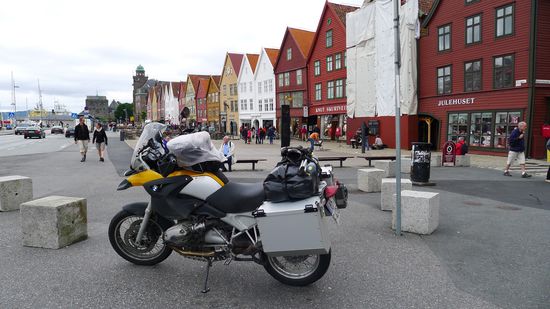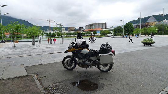 Also Plan B: Ich beschliesse, mein Möppi in einem Parkhaus abzustellen, Helm und Regenklamotten dort zu lassen, mir die Stadt anzuschauen und dann Abends auf einem der drei Campingplätze ausserhalb von Bergen wieder eine Hütte zu mieten.