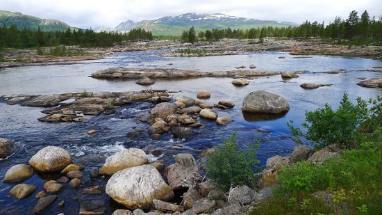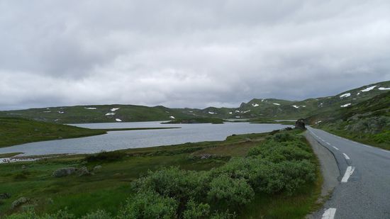 Ich komme ganze 500 m weit, da erwischt mich noch in Hovden der erste Regentropfen. Ich schaue mir den Himmel in der Richtung an, in die ich fahren werde und dort ist er dunkelgrau.