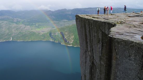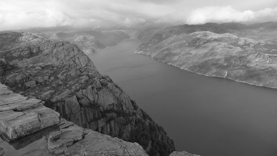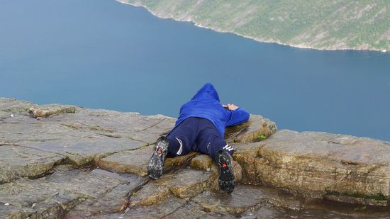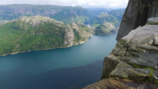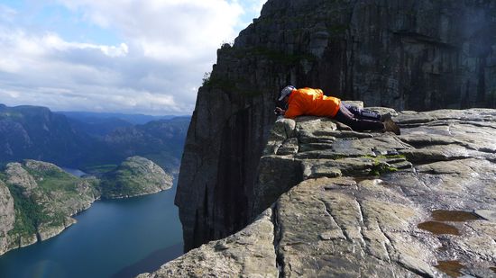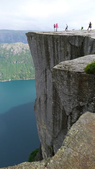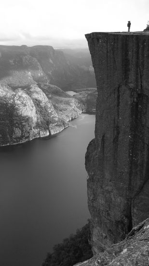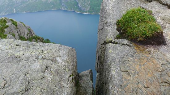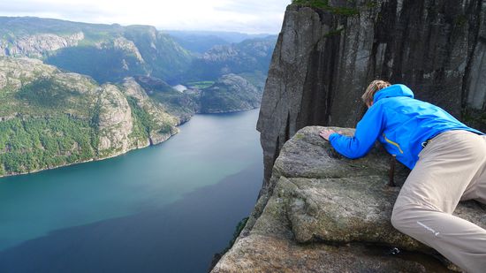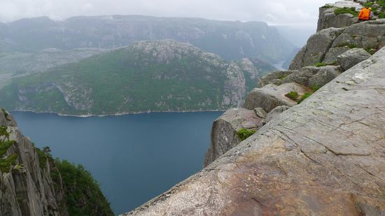 Der Preikestolen, zu deutsch Predigtstuhl, ist u.a. deshalb so bekannt, weil es an seiner Kante ohne Absicherung glatt und ohne einen einzigen Vorsprung genau 604 Meter in die Tiefe geht.