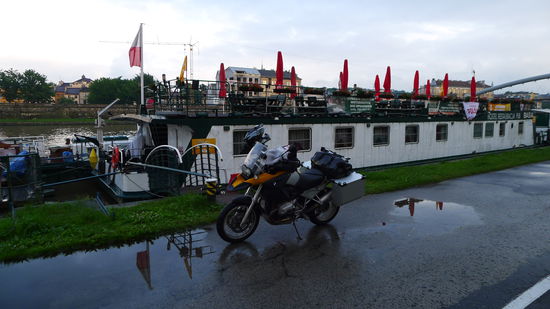 Mittlerweile hat auch Prag mitbekommen, dass ich abreise und weint...ne, es heult. Ich ziehe also mal wieder meine Regenklamotten an und hole mein Bike vom Parkplatz, um es vor dem Hotel zu packen. Schlüssel umdrehen, Startknopf drücken und sie blubbert vor sich hin. Ich gebe Gas und augenblicklich gräbt sich das Vorderrad in den Schotter und ich habe alle Mühe, dass mir der Bock nicht zur Seite wegkippt. Was ist das denn für eine Scheisse...ich gebe vorsichtig Gas und das Hinterrad dreht durch, ich bewege das Möppi vor und zurück und gebe mehr Gas, um aus dem Schotter rauszukommen. Widerwillig schiebt sie sich Meter für Meter mit durchdrehendem Hinterrad nach vorne...Das kann doch nicht wahr sein...plötzlich geht mir ein Licht auf...ich Depp habe das Bremsscheibenschloss nicht abgenommen, klar das sich das Vorderrad nicht bewegen lässt...