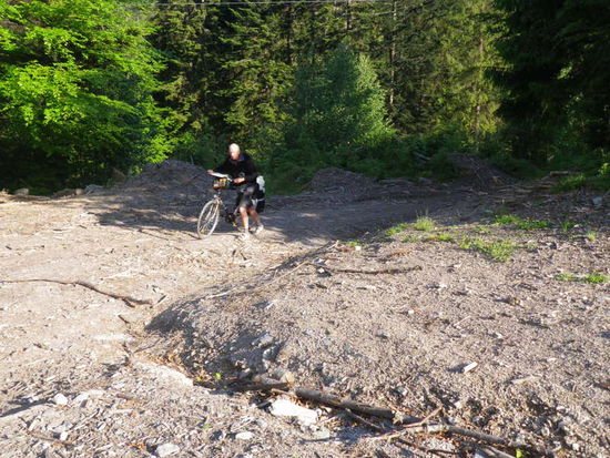 Schnell bringen wir Improvisation und Logistik wieder in Einklang. Gegen 15 Uhr starten wir mit dem Ziel, unsere Verspätung einzuholen. Fahren wir einfach 20 km weiter östlich übers Slowakische Erzgebirge, schließlich zeigt die Karte dort einen Montainbikeweg nach Mlynki auf der Südseite, das sind auch nur 38 km, der Paß dorthin ist auch nur wenig höher. Dazu scheint die Sonne erstmals so warm, dass wir im T-Shirt fahren können; unsere Unternehmungslust ist kaum noch steigerungsfähig.