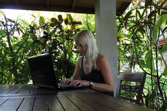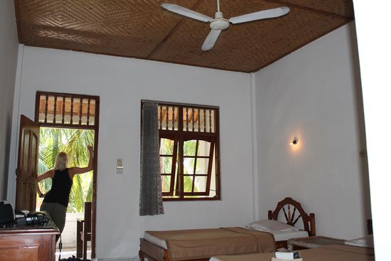 Wir sind faul und schauen uns nur drei Übernachtungsmöglichkeiten an. Für 175.000 Rupiah (15€) beziehen wir ein geräumiges Zimmer mit 2 Betten, haben einen eigenen Balkon "with view to the sea" - naja, irgendwo hinter den Palmen und der Hecke wird's schon sein, das liebe Meer - und freuen uns über einen neuen Duschkopf im Bad. Ein kleiner Pool im tropischen Garten rundet das Ganze ab.
