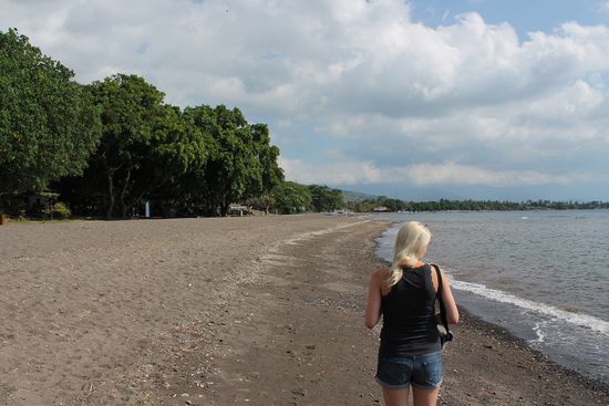 Danach folgt ein Spaziergang am Strand. Wir entdecken fünf andere verirrte Touristen, ansonsten gehört die Promenade uns. Das Meer jedoch ist eine echte Enttäuschung für Susi, irgendwie hat sie sich unter den schwarzen Lavastränden Lovinas etwas anderes vorgestellt. Ich bin noch selig, einfach nur aus Kuta weg zu sein, aber es stimmt schon. Der Strand ansich ist akzeptabel, aber der Zugang zum Wasser kommt ohne Badeschuhe (haben wir dabei) einer gratis Reflexzonenmassage gleich.