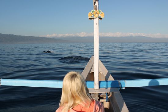 Wie immer haben wir uns für die unkonventionelle Methode entschieden, anstelle in einem der zahlreichen "Büros" zu buchen, haben wir uns von unserer Unterkunft an den "Bruder des Cousins des Neffen vom Onkel" (auf Bali sind ja alle irgendwie miteinander verwandt...) vermitteln lassen. Wie bereits erwähnt, für 60.000 Rupiah (5€). Es dauert noch ein Weilchen, dann knattert ein Roller des Weges. Der gute Mann hat sichtlich Zeit - "too many boat now..." und verweist lächelnd Richtung Meer. Tatsächlich spielt sich dort ein skurriles Schauspiel ab: eine Armada von kleinen Booten kreuzt unentwegt umher, hin und wieder sieht man einzelne Blitze aufleuchten - da muss wohl ein glücklicher Photograph einen Delphin vor die Linse bekommen haben... - und sofort stürzen alle Boote in Richtung dieser Stelle. Irgendwie ähnelt das Ganze einer Hatz