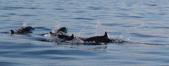 Eine halbe Stunde später sind dann auch wir draußen. Unser Kapitän scheint eine eigene Philosophie zu haben, er jagt die Delphine nicht - sehr zu unserer Freude übrigens - sondern er wartet auf sie. Das Ganze dauert zwar - Geduld ist eine, nicht meine, Tugend - geht aber am Ende auf. Während die Horden der Bustouris schon wieder Richtung Ufer geschippert werden, haben wir die Delphine für uns allein. Wir verweilen fast zwei Stunden bei den Meeressäugern und bekommen sie einige Male aus nächster Nähe zu Gesicht.