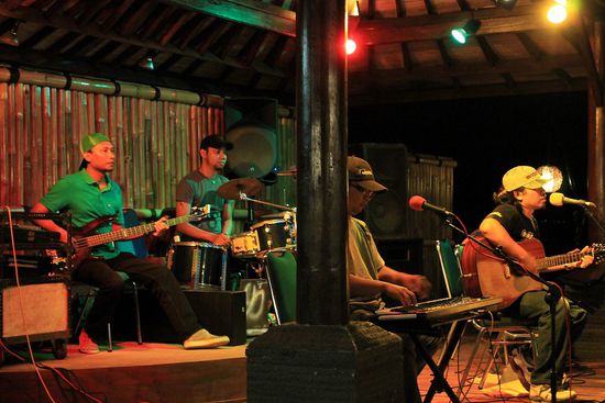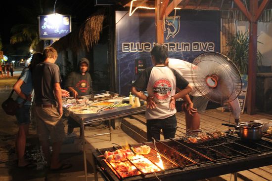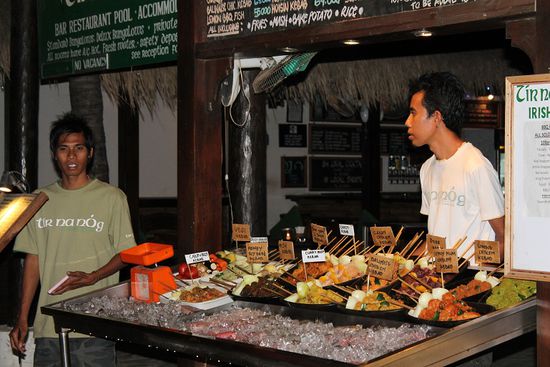 Zwischen den Tauchresorts entlang der Strandpromenade reihen sich Bars und Lounges, hier wird ebenfalls Live-Musik geboten und das Bier geht für landestypisch horrende 30.000 Rupiah (2,50€ - nicht vergessen, Indonesien ist ein islamischer Staat) über den Tresen. Dazwischen finden sich Restaurant die allesamt Buffetessen für 100.000 Rupiah (8€) pro Person offerieren.