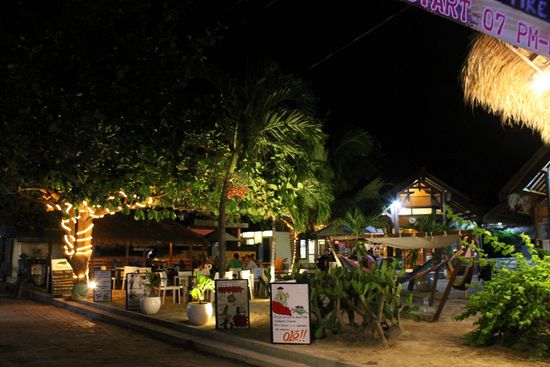 Abends spaltet sich Trawangan in drei Klassen. Rund um die beiden Luxushotels reihen sich ein paar edle Restaurant, hier kann man zu Live-Musik französischen Wein trinken (ab 80.000 / 7€), die Pizza kommt aus dem Steinofen (60.000 / 5€) und es stehen westliche Klassiker auf der Speisekarte.