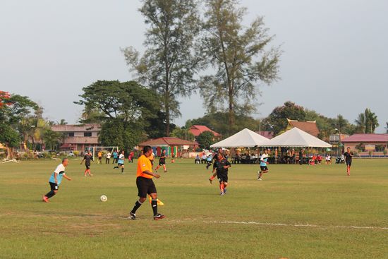 Noch 3 Stunden bis zur Abfahrt, das reicht uns locker um Tanah Merah zu erkunden. Rechts des Bahnhofs ein Sportplatz - und da wird gerade Fußball gespielt!